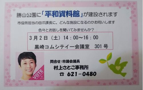 勝山公園内に「平和資料館」が着工予定です。 戦後70年以上が経過する中、戦争の悲惨な体験を忘れず、平和の大切さ・命の尊さをみんなで考えたい。 資料館には当時の北九州地域の戦災や戦時下の暮らしなどが展示される予定です。 どのような施設となるのか、…