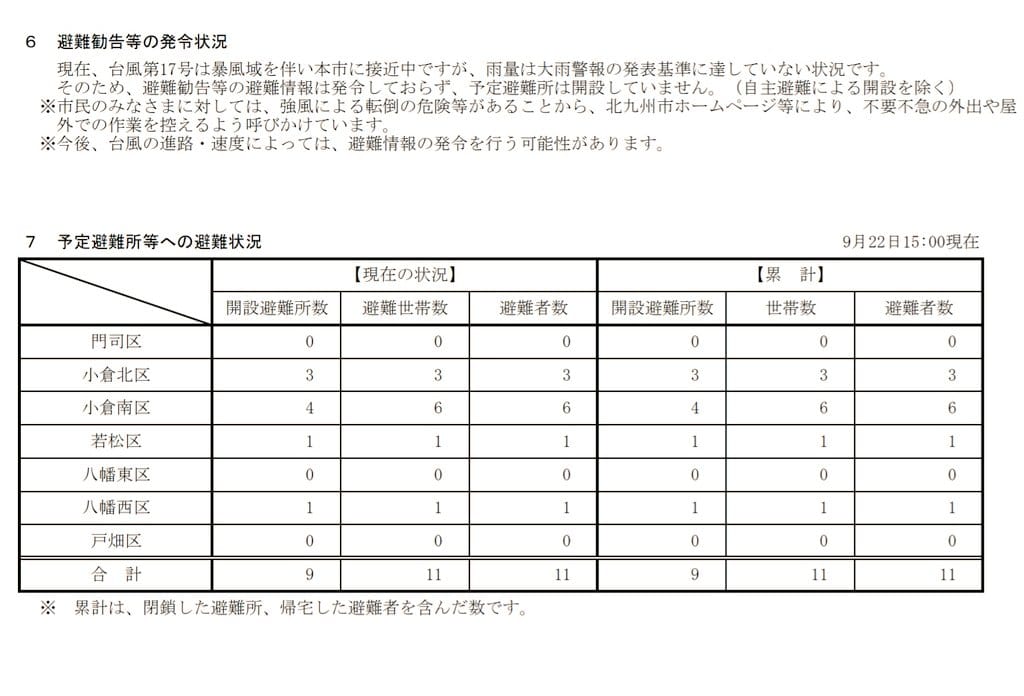 北九州市内の避難所開設状況です。
